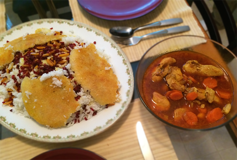 My friend Ann and her husband were over at my place a week ago. My friend’s husband and I enjoy some similar pain in the neck digestive issues and when we have to be careful with what goes in the meal when we cook for each other. This time I made them a berry rice mix with chicken stew which is again another popular Persian dish. When I say berry most of you probably picture blueberry, blackberry, raspberry or such but it’s none of them. This kind of berry is a member of berberis family, berberis aggregate. The dried version is what’s used in this dish called zeresh polo in Farsi.